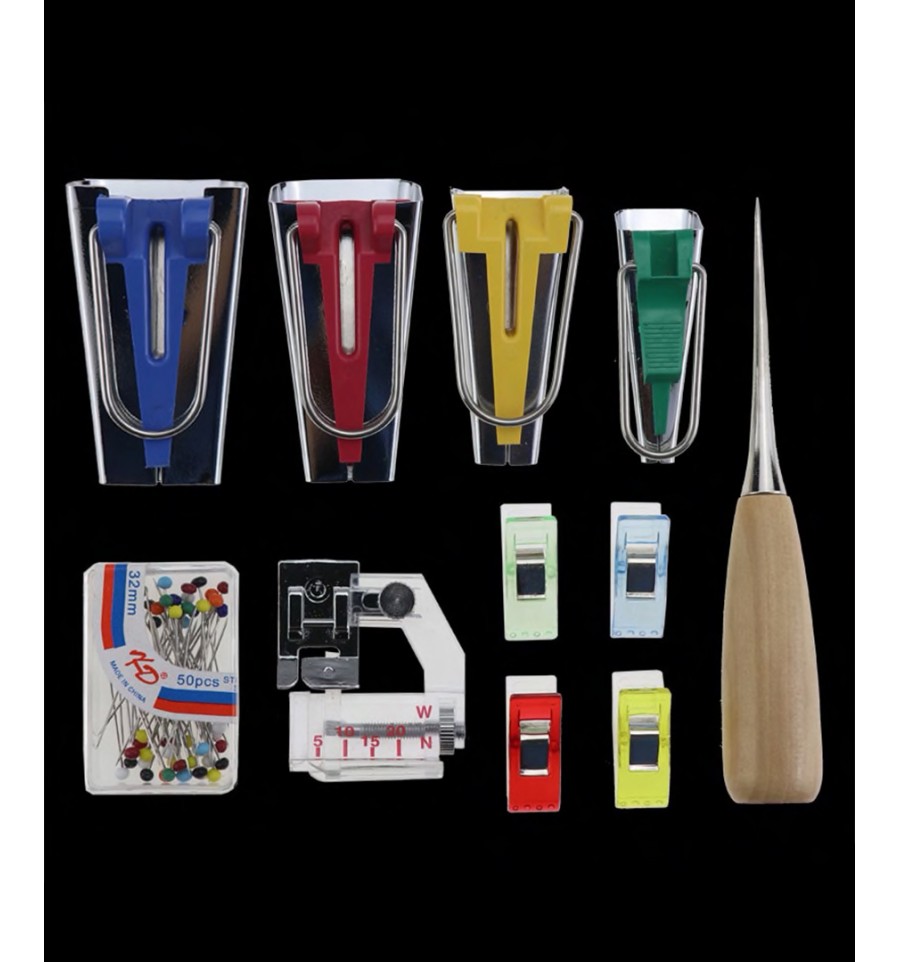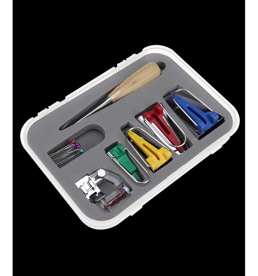 Vous retrouverez dans ce kit 4 appareils pour la réalisation de biais 6, 12, 18 et 25mm ainsi qu'un pied de biche pour la pose de biais, des épingles à têtes, un poinçon et des petites pinces plastiques.