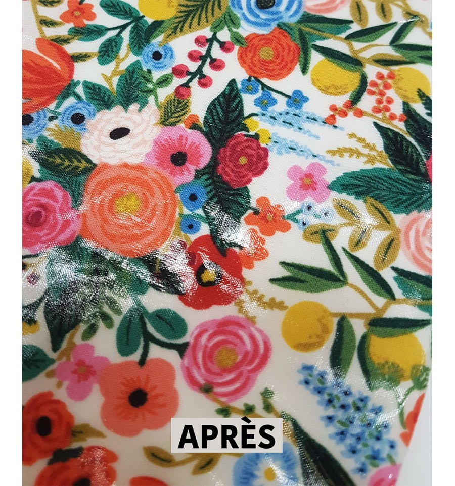 Une fois traité et repassé entre chaque couche, le tissu peut être cousu, coupé, nettoyé. Il possède alors une grande résistance à l'usure. Lavage possible à 30°C.