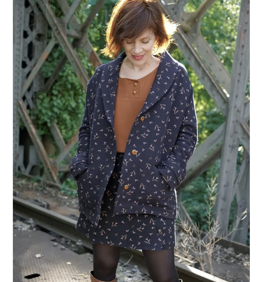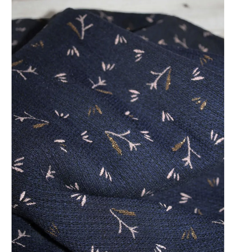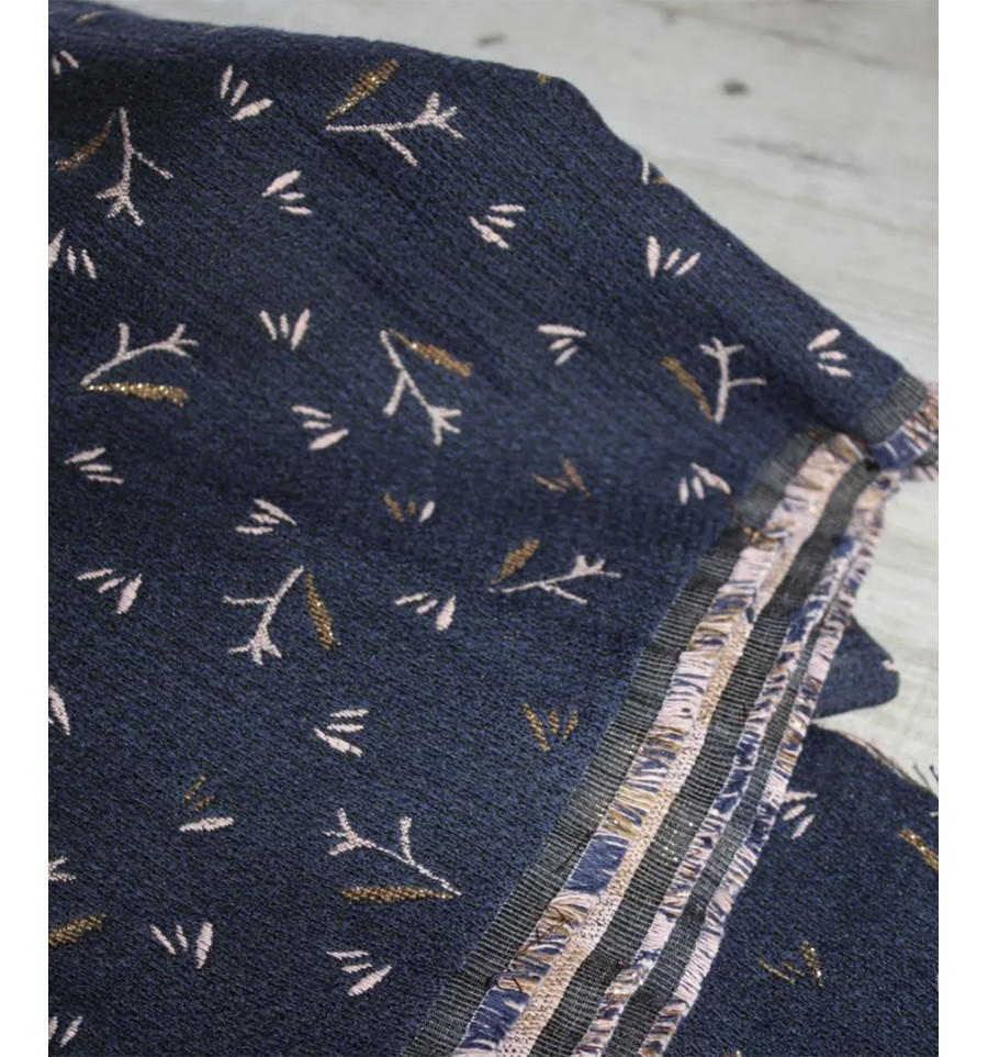 Inspiré par tiges et brindilles, notre jacquard Ramo met en scène un petit motif végétal dans lequel vous pourrez aussi bien imaginer un petit vêtement, comme un short effet jupe, qu’une grande pièce phare telle qu’un beau manteau. Délicate association de Bleu foncé, Rose perle et Caramel, ce tissu épais au si joli tissage nous inspire toutes sortes de vêtements, mais aussi pourquoi pas des accessoires et de beaux coussins ! Et forcément, ses petites touches scintillantes cuivrées font la différence…