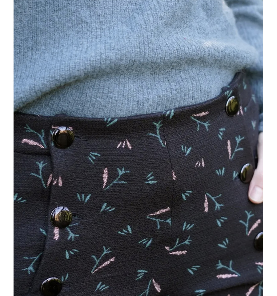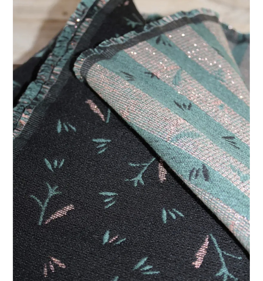 Inspiré par tiges et brindilles, notre jacquard Ramo met en scène un petit motif végétal dans lequel vous pourrez aussi bien imaginer un petit vêtement, comme un short effet jupe, qu’une grande pièce phare telle qu’un beau manteau. Délicate association de Bleu foncé, Rose perle et Caramel, ce tissu épais au si joli tissage nous inspire toutes sortes de vêtements, mais aussi pourquoi pas des accessoires et de beaux coussins ! Et forcément, ses petites touches scintillantes cuivrées font la différence…