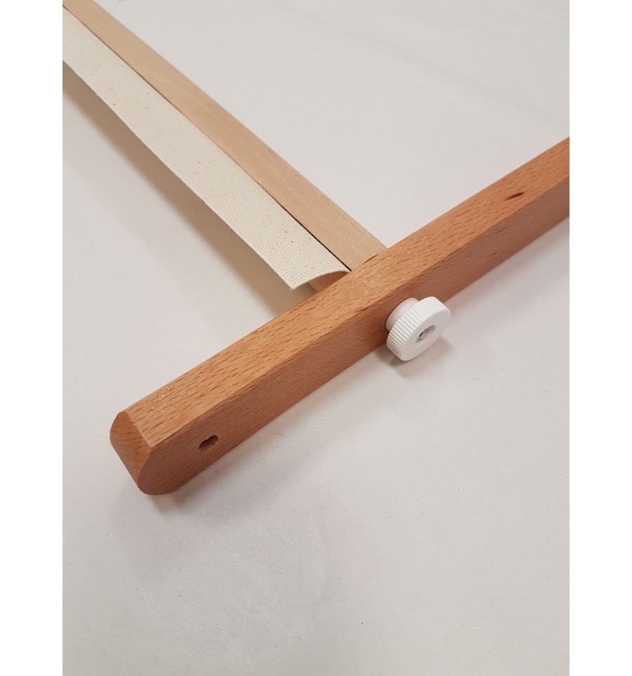 Pour accrocher votre toile, il vous faut la coudre grossierement sur le rebord en tissu du cadre et ensuite tendre la toile grace au pistons de serrage.