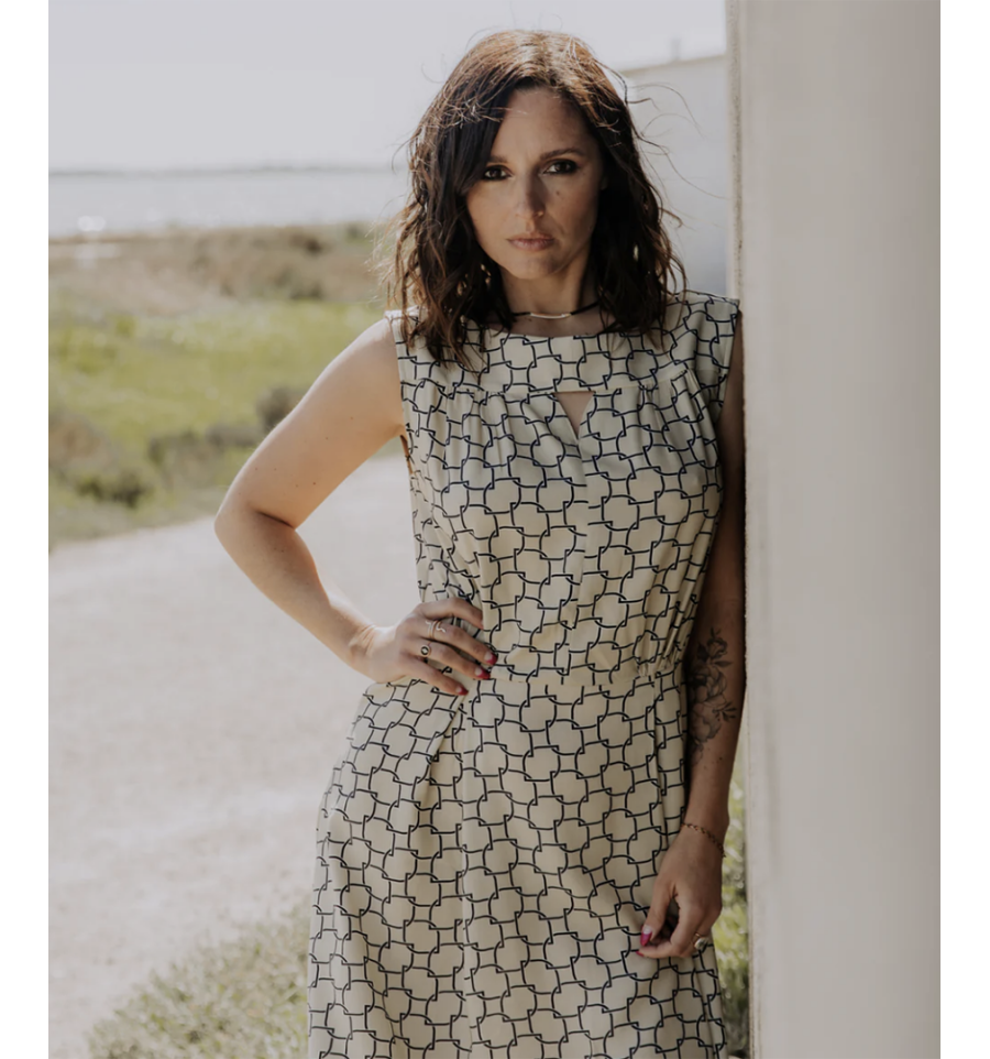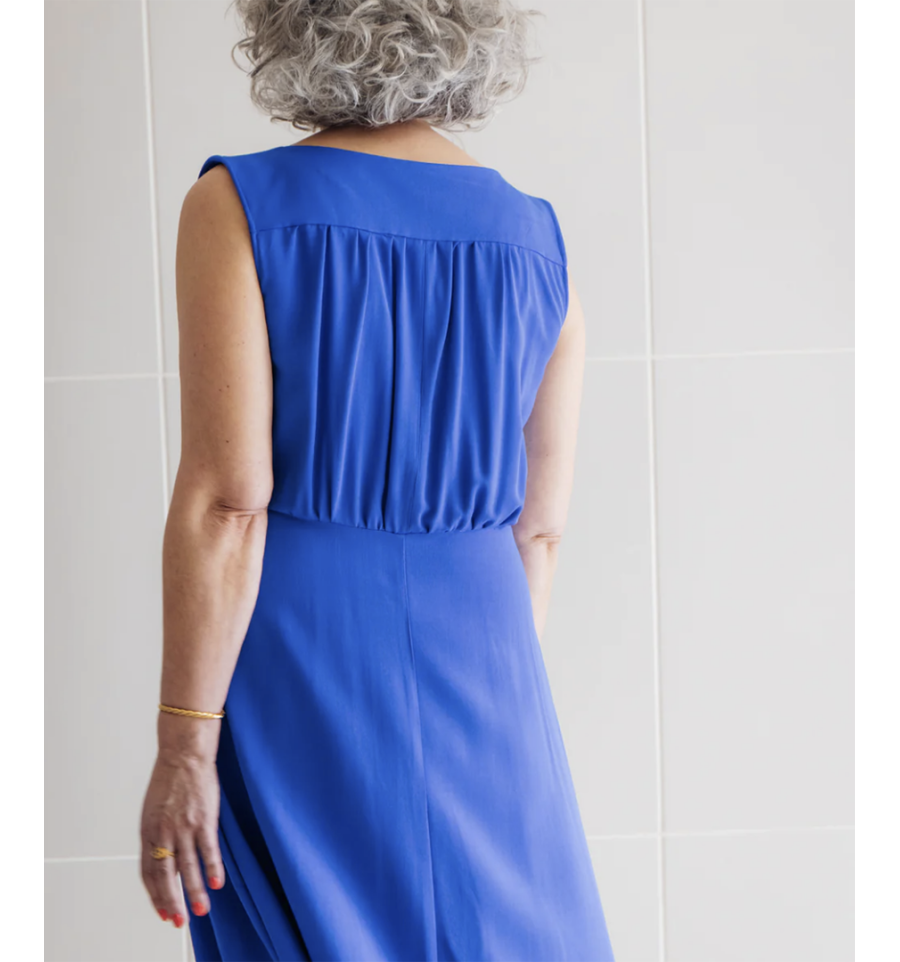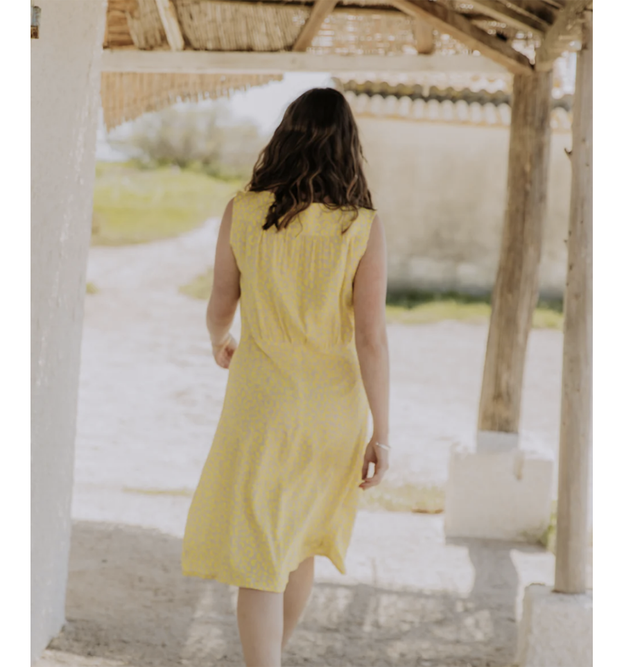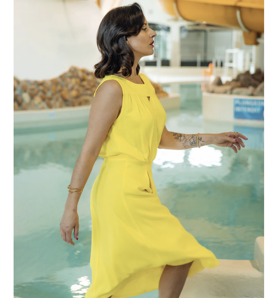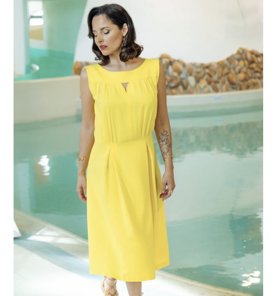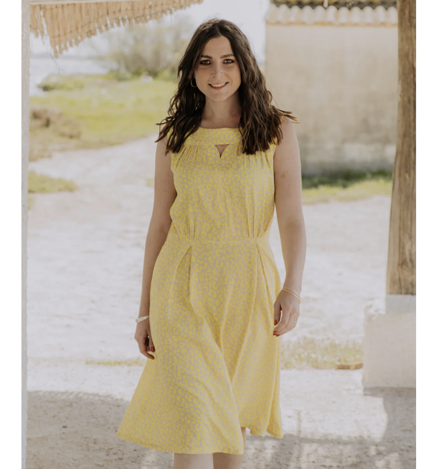 Il y a des robes, et il y a Haut Vol : une taille marquée, un buste souple à l'encolure soulignée d'empiècements qui structurent et font de belles épaules, une longue jupe dansante dont le devant est travaillé par 2 plis piqués qui font s'épanouir les volumes vers le bas du vêtement sans accentuer le bassin. Nouvelle robe, mais toujours le détail Fauve : une échancrure délicate qui laisse entrevoir un décolleté. Porter la robe Haut Vol, c'est avancer le regard fier, l'allure assurée, prête à sauter dans sa journée... Et se sentir pousser des ailes !