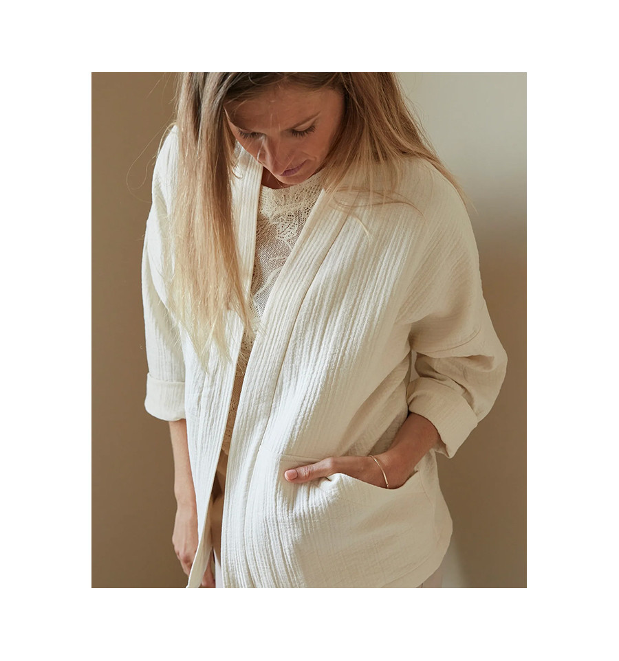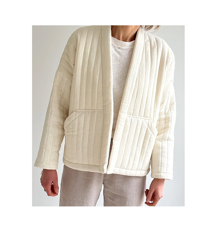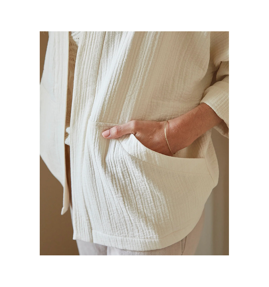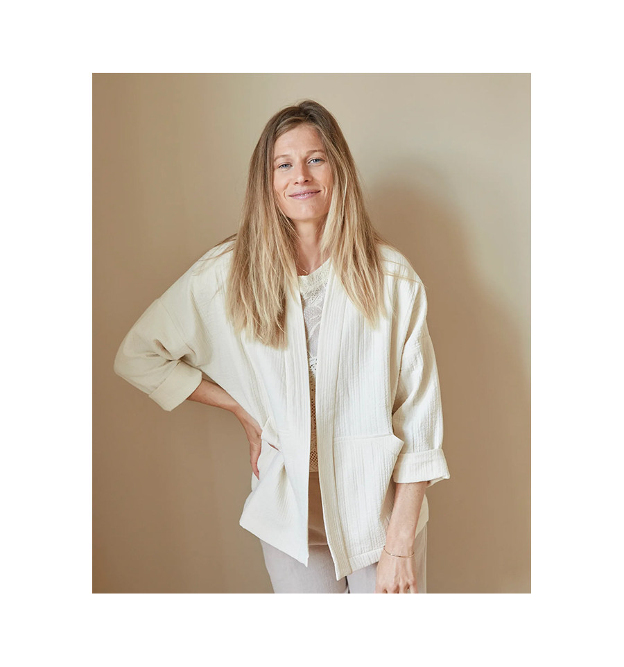 Inspirée du vestiaire japonais, la veste nomade réinterprête la veste kimono dans une lecture chic et décontractée. Coupe courte, poches plaquées ou grandes poches, manches basses, elle se réalise en 1h30 et peut être réalisée par un niveau débutant.