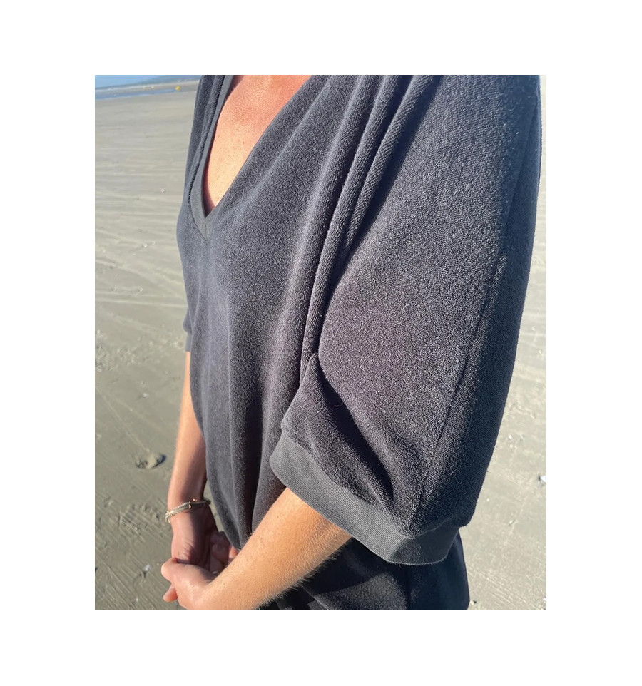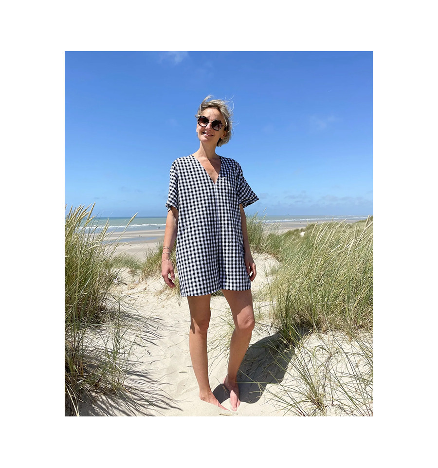 Le patron intègre une version robe avec 3 longueurs et 3 finitions pour le col (bande de propreté ou enforme, bord côte), il intègre aussi passant et ceinture et des poches prises en couture., Il intègre aussi une version combi-short avec la possibilité de la cintrer à la taille et une poche plaquée dos. Pour ajouter une coulisse aux épaules. Téléchargez Extension guide pour coulisses épaules