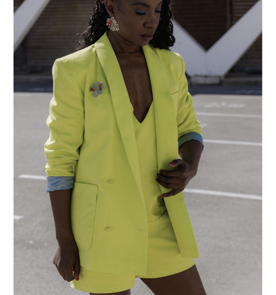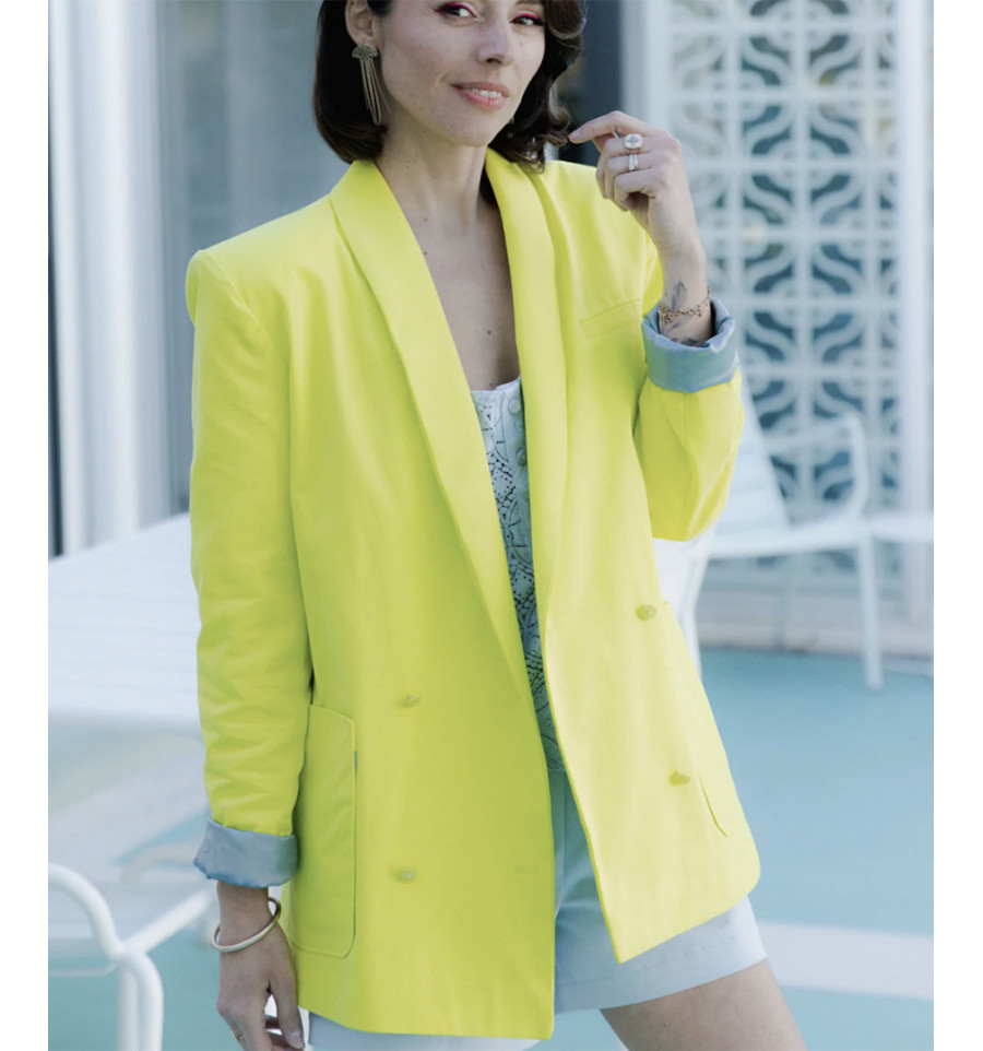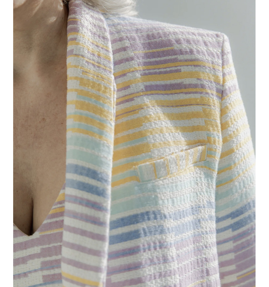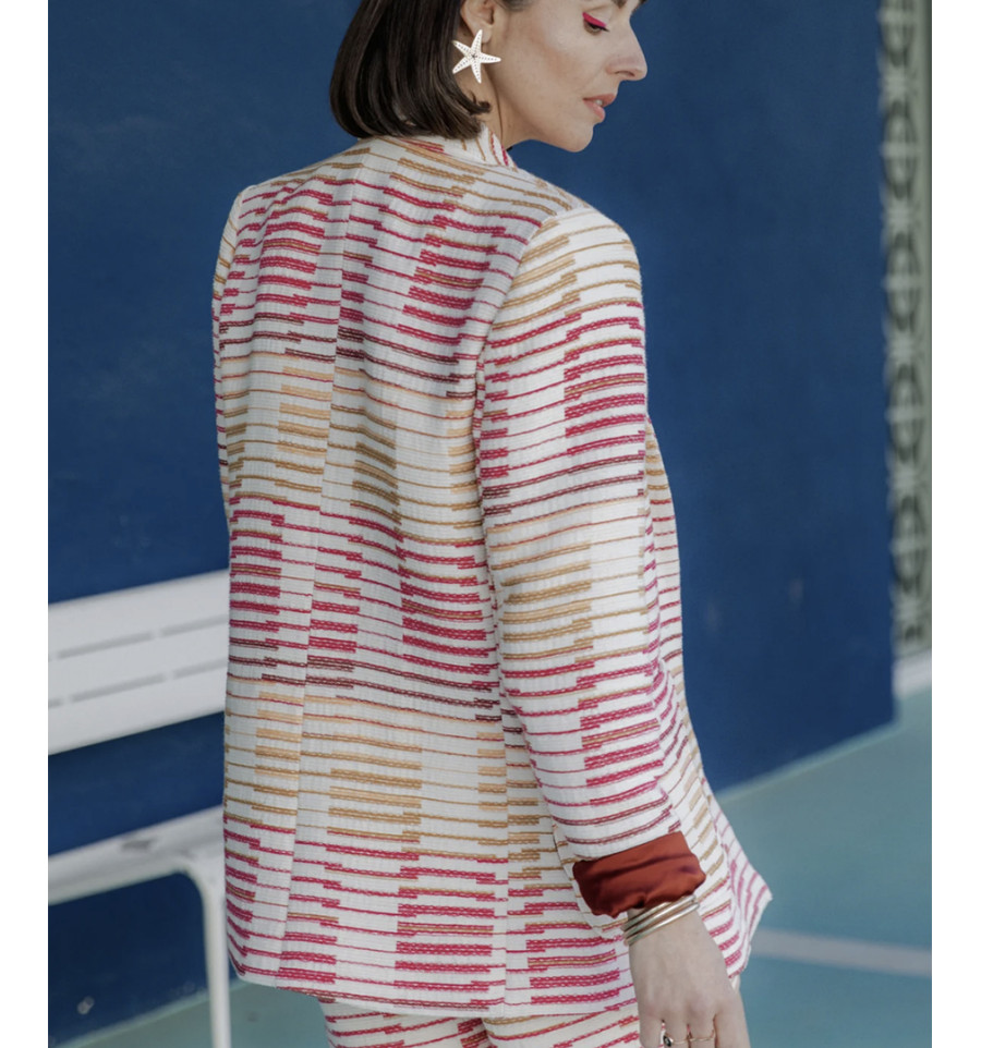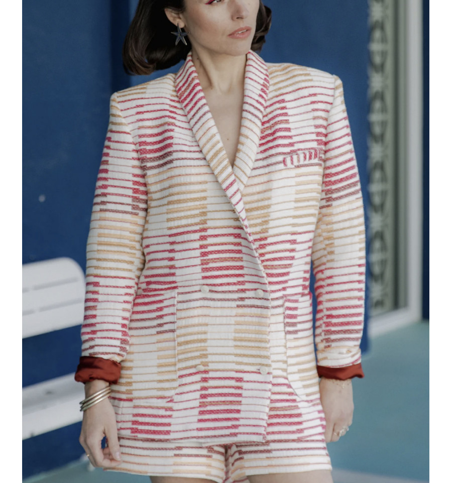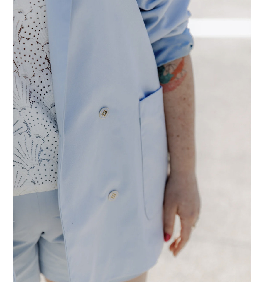 Élégant sans y penser, le blazer MIMOSA est la pièce forte de la collection Fauve Romance. Sa coupe droite est très construite par des manches en 2 parties, un petit côté, une fausse poche poitrine passepoilée et de très grandes poches plaquées arrondies dont le design rappelle le col châle et adoucit l’allure un peu boyish de cette veste au volume retravaillé et aux épaules marquées.