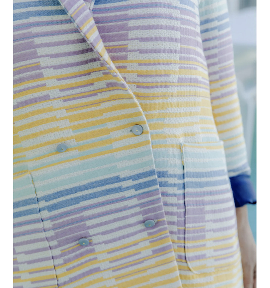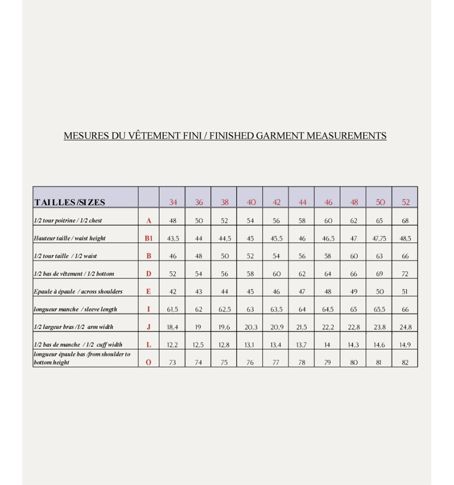 Un lainage de poids moyen, du tweed, du jacquard, de la gabardine, du jean, des tissus de poids environ 200 à 350g/m2 afin de mettre en valeur la coupe droite et la ligne du col et des épaules. Pour la doublure, je vous recommande de choisir un tissu spécifique pour les doublures, comme notre doublure 100% cupro glissante et plus respirante que du polyester.