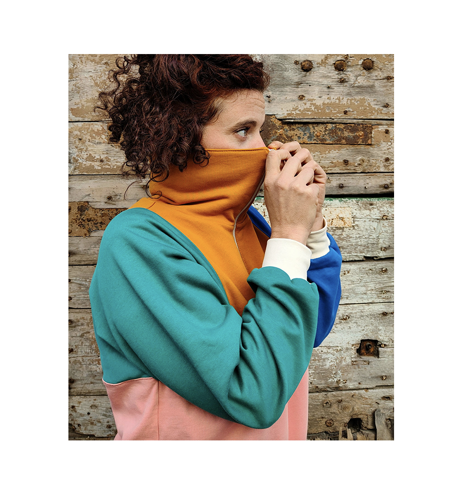 Atlas est un sweat oversize aux manches kimono dont les empiècements géométriques permettent de s’amuser avec les couleurs sans modération. Côté finitions, le col et le buste sont doublés. Dans sa version col chemisier, le col est réalisé en tissu chaîne et trame type gabardine fine ou popeline.