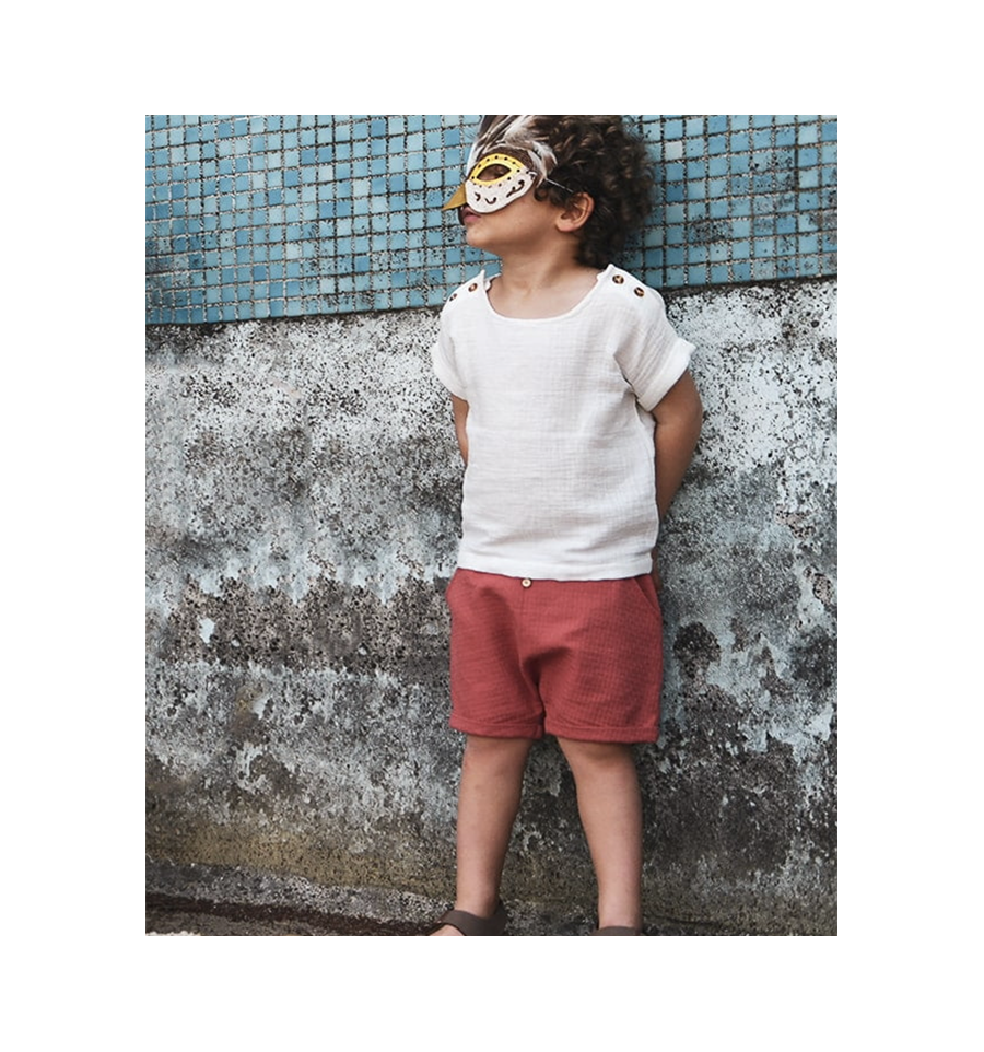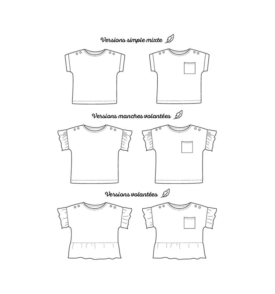 C’est le petit haut que l’on accorde avec tout et que l’on peut réaliser dans une multitude de tissus. Ses pattes de boutonnage aux épaules font tout son charme. On vous propose différentes finitions de manches selon le look que vous souhaitez lui donner. Un revers simple pour une blouse classique, un joli revers pour plus d’originalité ou des volants vaporeux pour une touche plus bohème. Vous pourrez également choisir d’ajouter une basque en bas de blouse pour les fillettes.