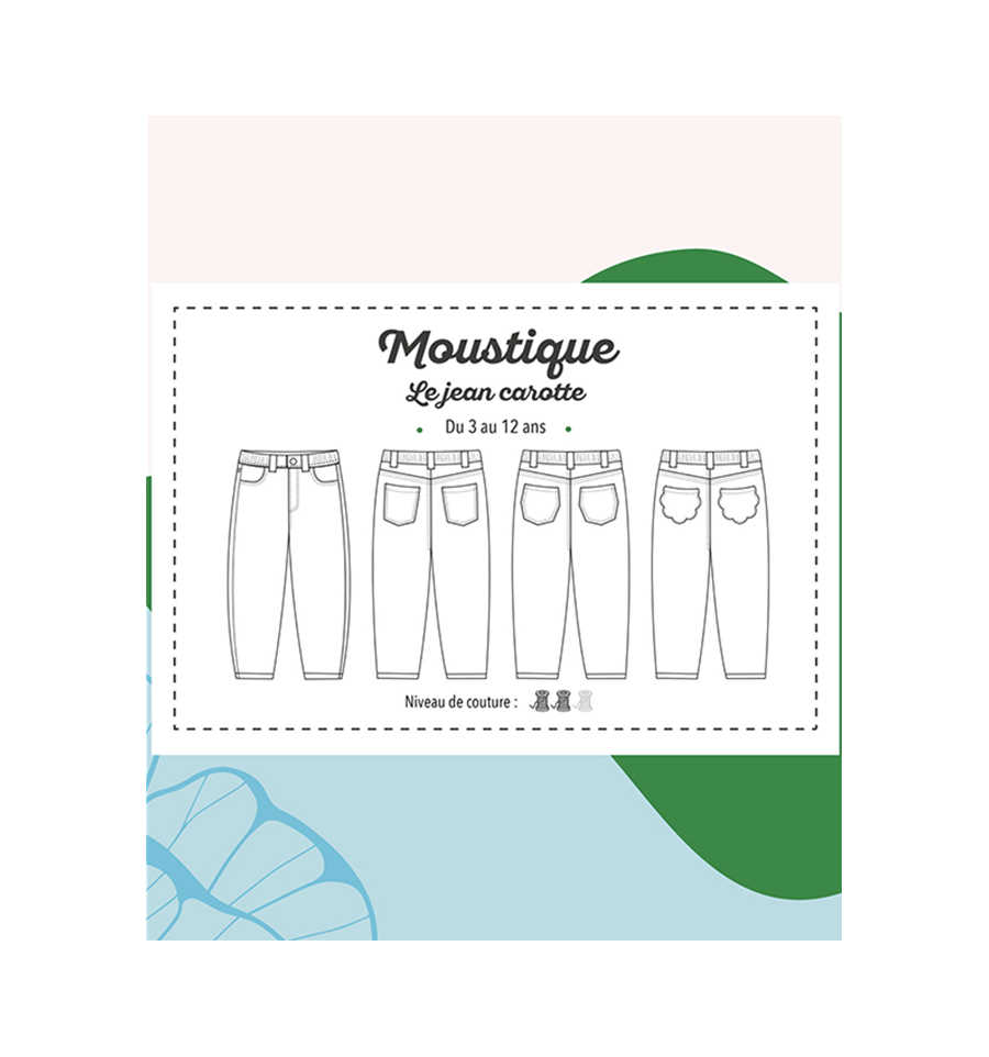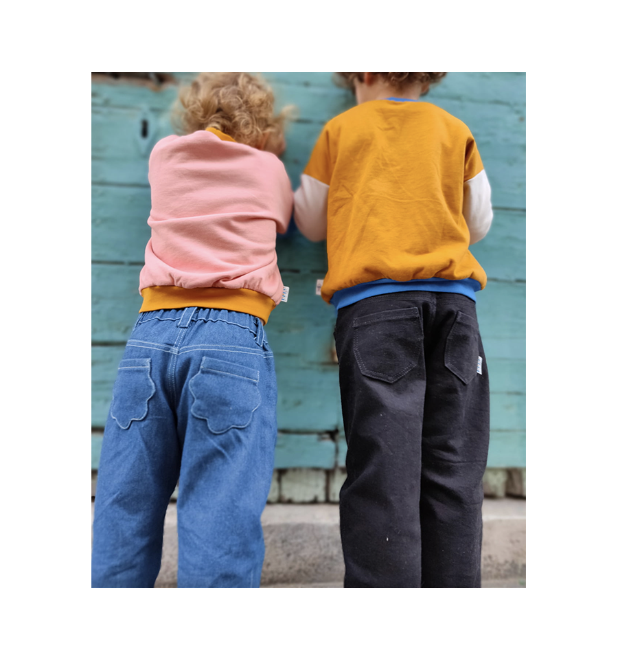 Moustique est un patron de jean mixte à la coupe carotte à porter toute l’année et qui offrira le plus grand confort à vos enfants tout en garantissant un maximum de style !