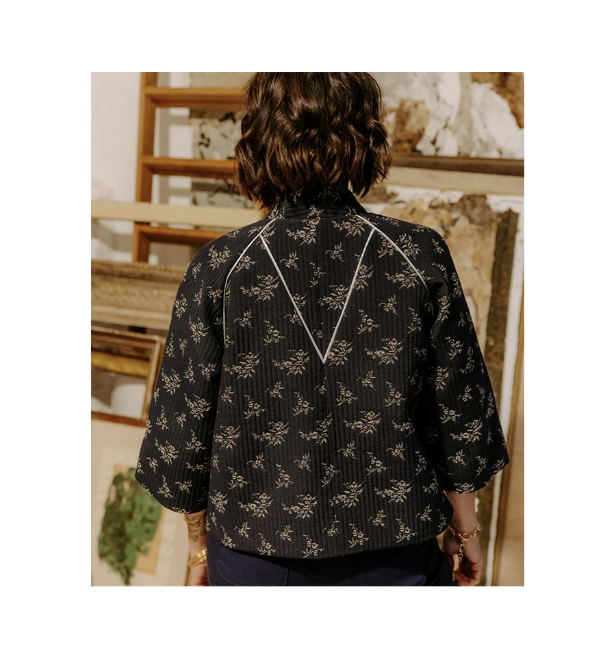 selon le rendu souhaité, très souple ou plus structuré, vous pouvez aussi bien coudre votre veste en viscose, et satin de coton, en crêpe qu'en jacquard de poids léger à moyen, lainage fin, gabardine fine.