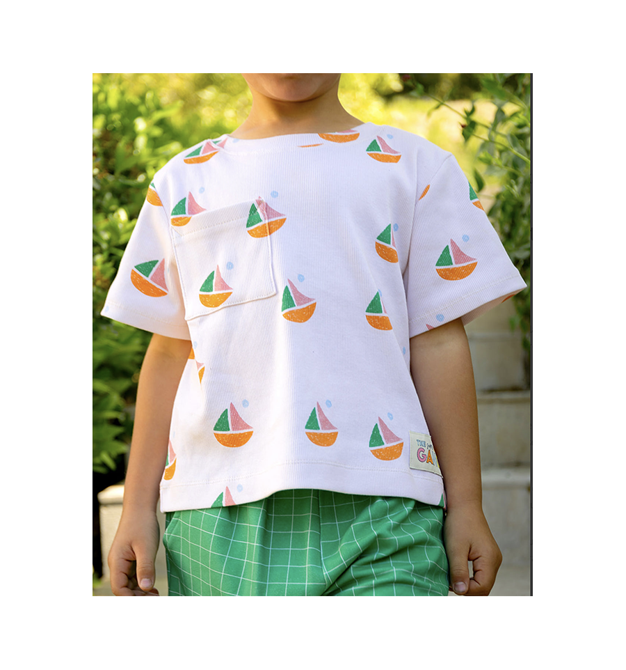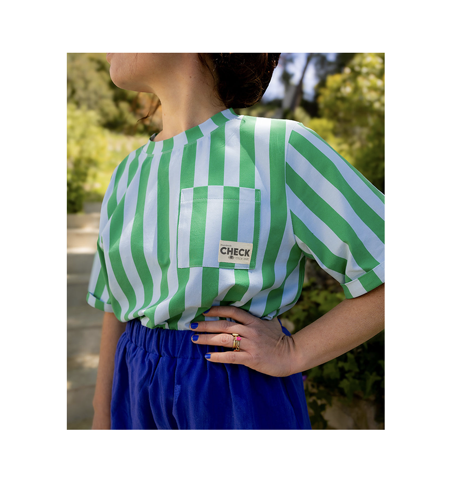 - Un t-shirt oversize mais pas trop avec une grande poche coeur. Pour la femme et l’enfant, il est possible de le réaliser en version crop ou longue. Il possède plusieurs longueur de manches et la possibilité de réaliser un revers si on le souhaite.